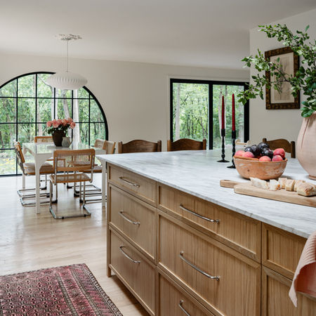 The Owner's distinct design style, neutral and calm aesthetic, desire for more natural light, and facebook marketplace prowess really drove the design. We reconfigured the Master Suite, added a lot more windows and a really spectacular tub/shower room with natural marble and handmade tiles galore. We carried arched openings through the house- down the hallways, and into the pantry door and huge new dining room window. We reconfigured the old kitchen - outfitting it with new white oak cabinetry (built by the homeowner's brother and Dad).